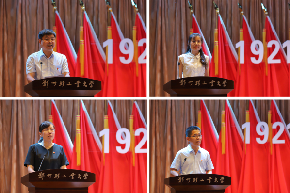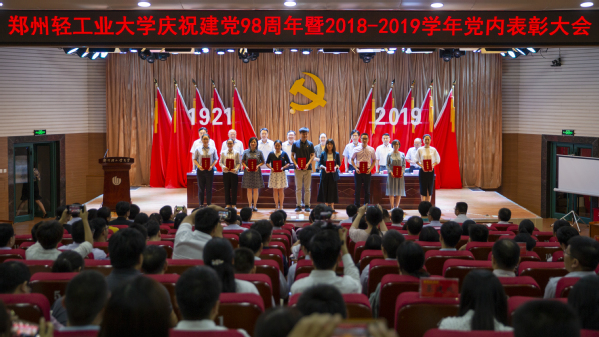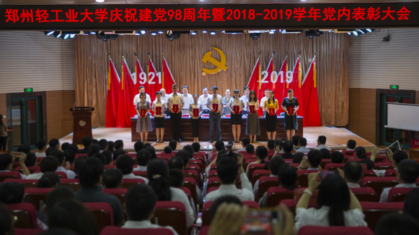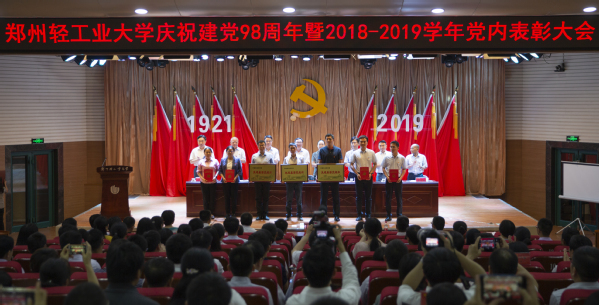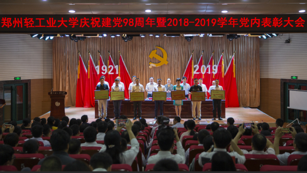大会在庄严的国歌声中拉开序幕。副校长刘新田宣读了中共河南省委高校工委《关于表彰委管高校优秀共产党员、优秀党务工作者和先进基层党组织的决定》和中共华亿在线体育中国有限公司委员会《关于表彰2018-2019学年优秀共产党员、优秀党务工作者和先进基层党组织的决定》。校领导向受表彰的先进集体和优秀个人代表颁发了奖牌和荣誉证书。材料与化学工程学院党总支书记康国磊、食品与生物工程学院学生第一党支部书记李燕、经济与管理学院行政教工党支部书记时军鸽、艺术设计学院党总支委员任红印作为受表彰的先进集体和优秀个人作了交流发言。