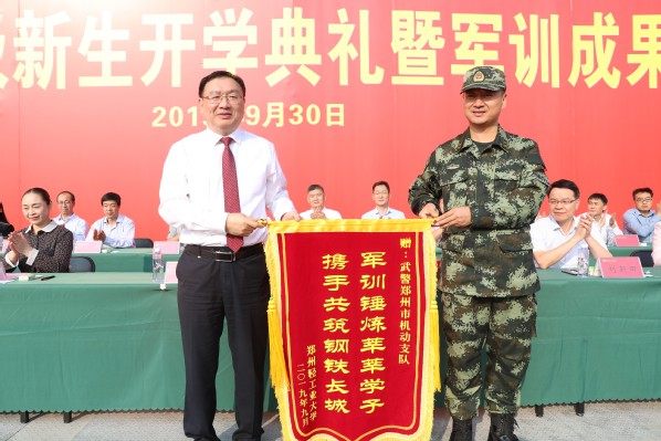 党委书记俞海洛代表学校向承训部队赠送锦旗和纪念品,感谢部队官兵对我校新生军训工作的辛勤付出。