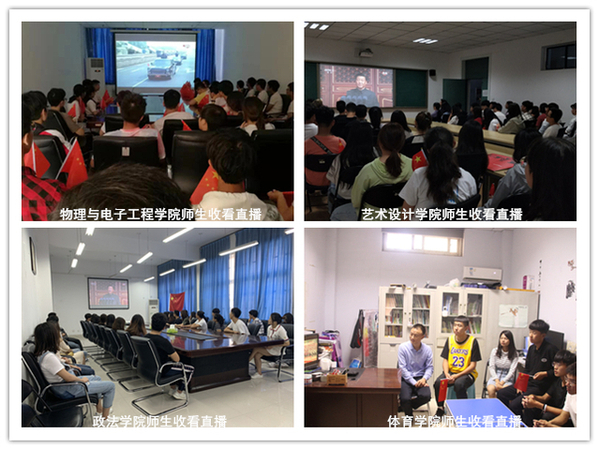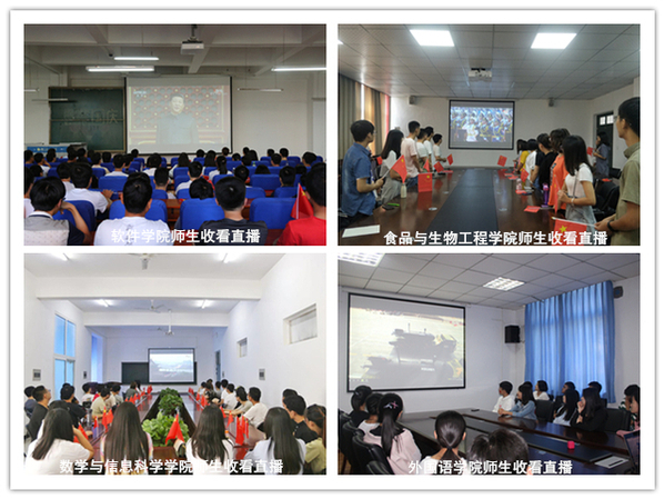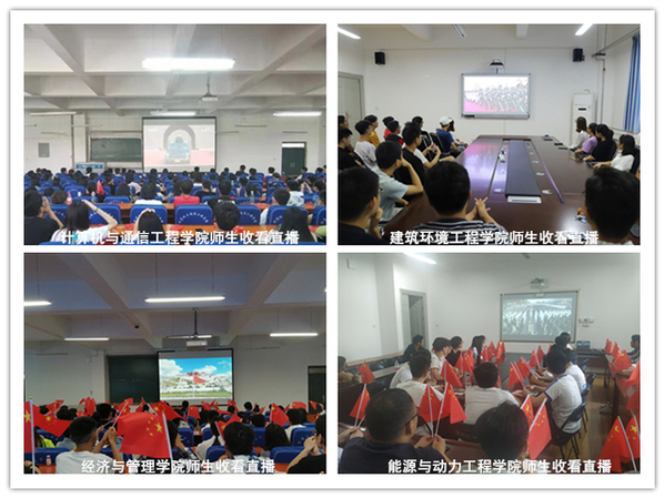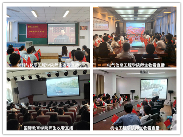101日上午10时,庆祝中华人民共和国成立70周年大会在北京天安门广场隆重举行。中共中央总书记、国家主席、中央军委主席习近平出席大会并发表重要讲话,随后进行了盛大的阅兵式及群众游行。我校在两校区组织师生分别在科学校区活动中心208室、东风校区图书馆学术报告厅、第三会议室集中收看了大会实况,各学院师生通过电视、手机、电脑在会议室、教室、宿舍、校园、实验室等场所收听收看了本次直播盛况。