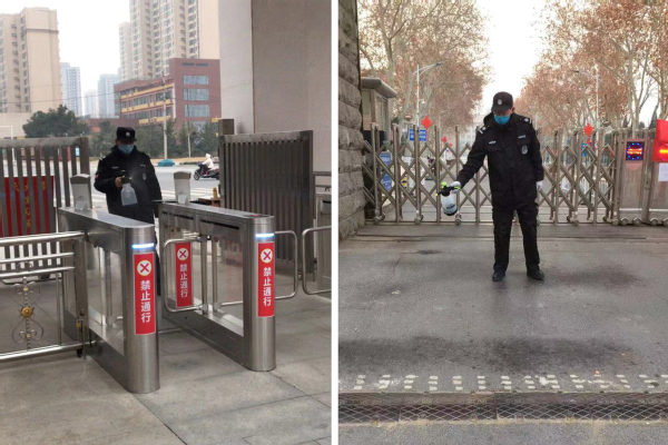 安保人员进行校门口日常消杀工作