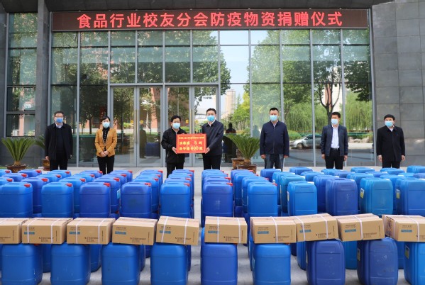 我校食品行业校友分会始终心系母校,在学校即将开学之际,经广泛倡议,多方筹措,向母校捐赠5吨消毒液,400瓶洗手液。秘书长翟耀坤代表校友分会在发言中表示,食品行业校友分会自成立以来,始终发扬“为之则易,不为则难”的校训精神,以“创新、发展、社会担当”的理念为母校和校友服务,为中国食品行业的发展贡献力量。病毒无情人有情,在这个特殊时期,食品行业校友分会的全体校友希望以自己的绵薄之力,与母校携手抗疫、共克时艰。