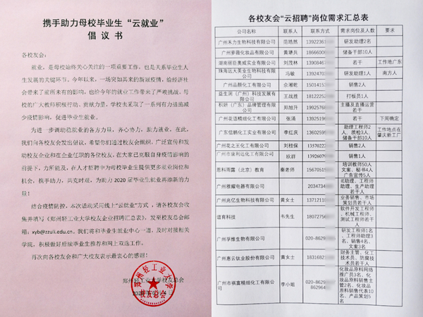 在学校“云就业”倡议发出后,北京校友会、上海校友会、广东校友会等地方校友会,食品行业校友会、日化行业华南校友会、日化行业华东校友会等行业校友会,以及国旗班校友会、艺术团校友会等社团校友会,积极响应,广泛参与,很快在校友中引起了热烈反响,达成了广泛共识,广大校友企业、校友任职企业通过不同方式,积极为毕业生牵线搭桥、提供岗位。经各校友会和广大校友的共同努力,共有50多家校友企业参与“云招聘”活动,提供就业岗位300余个,涉及全校20多个专业,400余名毕业生参与了“云招聘”活动,180余人达成就业协议。