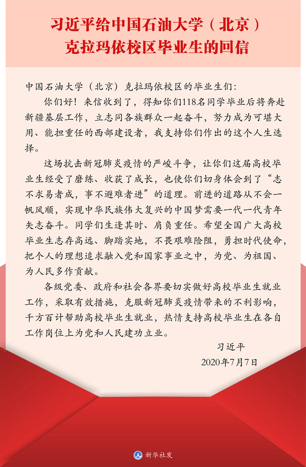 7月7日,中国石油大学(北京)克拉玛依校区118名同学给习近平总书记写信,汇报了他们毕业后将奔赴新疆基层工作,立志同各族群众一起奋斗,努力成为可堪大用、能担重任的西部建设者。7月7日,习近平总书记以“把个人理想追求融入党和国家事业之中”为题回信并寄语高校毕业生,今年抗击新冠肺炎疫情的严峻斗争,让高校毕业生经受了磨练、收获了成长,也使大家切身体会到了“志不求易者成,事不避难者进”的道理;希望全国广大高校毕业生志存高远、脚踏实地,不畏艰难险阻,勇担时代使命,把个人的理想追求融入党和国家事业之中,为党、为祖国、为人民多作贡献。