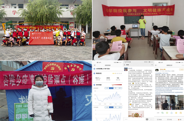 2020年初,一场新冠肺炎疫情席卷全国,身在全国各地的食为天志愿者们快速行动起来,党员们率先垂范、冲锋在前,累计30余名师生志愿者主动投身家乡疫情防控和学校联防联控工作一线,他们有的协助当地进行住户人员信息统计,有的利用专业知识进行疫情科普宣传,有的在卡点进行来往行人和车辆劝返登记,有的为居家隔离的群众采买生活物资,多名志愿者还通过捐款捐物献出自己的一份力量。在返校复学的关键时期,在学校的集中领导下,23名志愿者服务在学校、火车站、机场等地接送学生,服务学校疫情防控大局。他们不畏艰险、不惧挑战,用实际行动书写着新时代的志愿服务精神。当在一次团日活动中分享抗疫故事时,志愿者们被问到有没有感到害怕,2017志愿者王宝雪说,“当时没有想那么多,只是觉得国家有难,我是党员我应该出一份力,我们村委后来成立了党员抗疫服务队,我们常常是第一个上岗,最后一个回去,每天在村口看到寒风中高高飘扬的党旗,我心里特别安稳。我相信,我们都相信,有党的坚强领导,全国上下一心,就没有克服不了的困难!”今年暑假,学院招募线上爱国卫生宣讲员,100余名志愿者积极报名,化身线上食品安全“代言人”,在各自朋友圈、微信群、QQ群空间等宣传疫情防控、食品安全和文明用餐知识,倡导公筷公勺、分餐进食等文明用餐新风尚,并在指定微博话题进行评论,让更多的人关注饮食安全,助力国家文明乡风建设和常态化疫情防控工作。短短一周,#文明用餐、小“食”代言#微博话题发布评论400条,阅读量达10万次。新时代的志愿者们,正在用自己的实际行动,书写着大写的青春