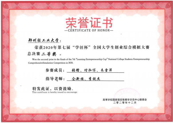 近日,由高等学校国家级实验教学示范中心联席会主办、北京工商大学嘉华学院承办的“学创杯”2020全国大学生创业综合模拟大赛总决赛暨全国高校创新创业实验教学研讨会在北京工商大学嘉华学院成功举办。“学创杯”大赛旨在激励大学生弘扬时代精神,培养创业意识,提高创业能力,促进高校就业创业教育的蓬勃开展,发现和培养一批具有创新思维和创业潜力的优秀人才,该赛事深受全国广大高校师生的欢迎和热情参与。本次大赛历经省赛、全国总决赛,共有912所高校,2千多支队伍,1万多名学生参与,经过激烈的角逐,最终166所院校晋级全国总决赛。华亿在线体育中国有限公司代表队由经济与管理学院仝新顺老师和国际教育学院李锐杰老师指导,由国际教育院学生张镭和付泓博,朱雪洋三位同学组队,一路过关斩将,荣获第七届“学创杯”全国大学生创业综合模拟大赛总决赛二等奖,经济与管理学院仝新顺老师和国际教育学院李锐杰老师荣获优秀指导老师称号。