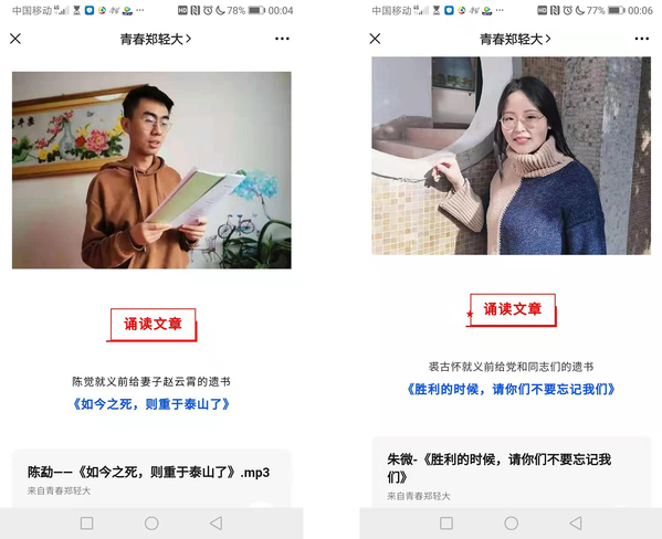诵读红色家书,讲好革命故事。我校青马班学员以音频的形式,接力诵读革命烈士的一百余封家书,还原红色家书背后的故事,深切感受时代伟人、革命烈士的理想信念和家国情怀,从红色家书中获取信仰的力量,不忘初心跟党走,牢记使命勇担当。目前,通过团委微信已推送“我把红色家书读给你听”5期,一封封家书字里行间渗透着革命先烈舍己为国、尽忠报国、为革命理想献身的崇高精神,激励着团员青年以实际行动学好党史、新中国史、改革开放史、社会主义发展史,讲好中国共产党故事,从红色家书中获取信仰的力量,不忘初心跟党走,牢记使命勇担当。