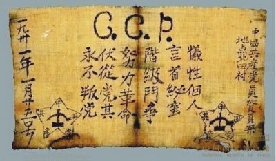 这份入党宣誓书收藏在中国国家博物馆,也是现存最早的入党誓词文物。入党宣誓书的中间是入党誓词,从右向左分别是:“牺牲个人,言(严)首(守)纟必(秘)蜜(密),阶级斗争,努力革命,伏(服)从党其(纪),永不叛党”;正面上方写着中国共产党的英文缩写“CCP”;右侧的落款是中国共产党员贺页朵,地点北田村,左侧是时间,1931年1月25号。