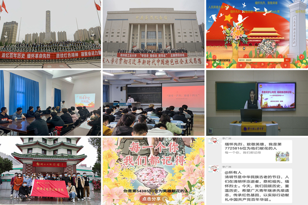 各基层党团组织“清明祭先烈”主题党日、团日活动设计丰富、形式多样,通过英雄事迹展览、读烈士之绝唱、烈士诗抄朗诵等活动,讲述学党史动人故事。机电工程学院、政法学院、国际教育学院、体育学院举办了“百年党史青年说”“微团课比赛”和“学习百年党史,凝聚奋进力量”庆祝建党100周年主题征文比赛等活动,以中国革命史、革命英烈、抗疫英雄等题材,创作演讲视频、主题征文等作品百余篇。
