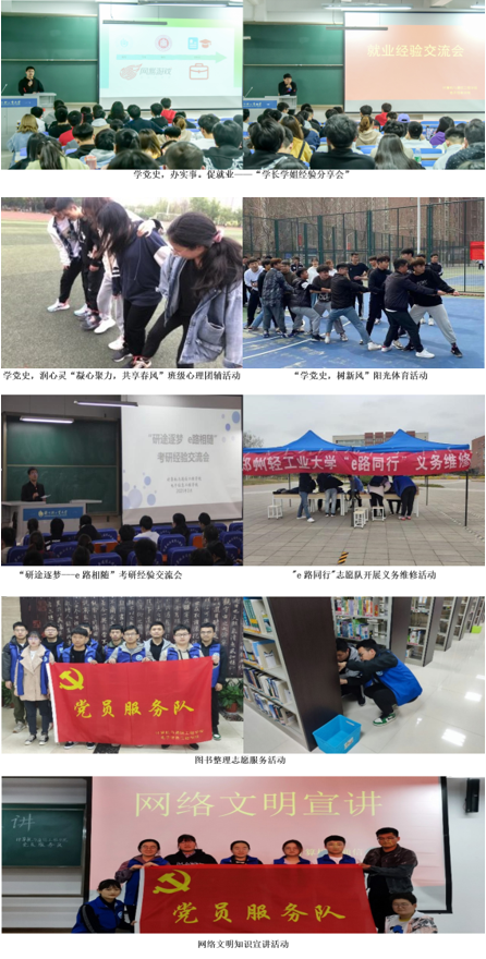 以开展党史学习教育为契机,学院开展“我为群众办实事”实践活动,建立工作台帐,在学生生活权益、学生创新创业、毕业生就业帮扶、学生心理辅导、班风学风建设等各个方面下功夫、办实事,累计解决师生难题30余项,先后开展“学党史,办实事,促就业”系列活动5次,“学党史,润心灵”系列活动3次,“研途逐梦---e路相随”考研经验交流会、“学党史,树新风”阳光体育活动、网络文明知识宣讲活动、图书整理志愿服务活动、e路同行志愿队开展义务维修活动。将学党史与办实事有机结合,让师生群众感受到学习教育带来的新变化、新气象。