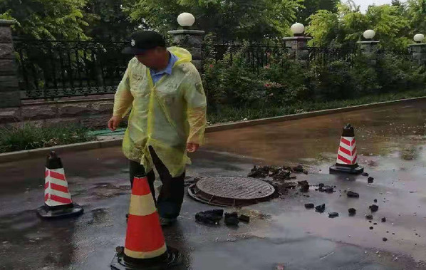 7月20日清晨,考虑到降雨已经持续一天一夜,保卫处负责同志召集两校区相关人员冒雨涉水,对校园教学楼地下室、地下停车场、道路等场所设施进行安全隐患排查,并将有关情况第一时间通知相关单位,提醒做好自救防范。20日晚,随着雨势持续加大,保卫处迅速组织人员对受损围墙进行加固,对塌陷路面及窨井进行警戒隔离,对受阻车辆提供帮助,全力做好自救互救。