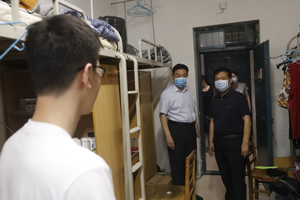 在学生宿舍,校领导详细了解了宿舍出入管理、卫生消毒防疫等工作,实地查看了汛情过后宿舍环境卫生恢复情况,并对留校学生表示慰问,叮嘱留校学生在做好个人防护的前提下认真学习。