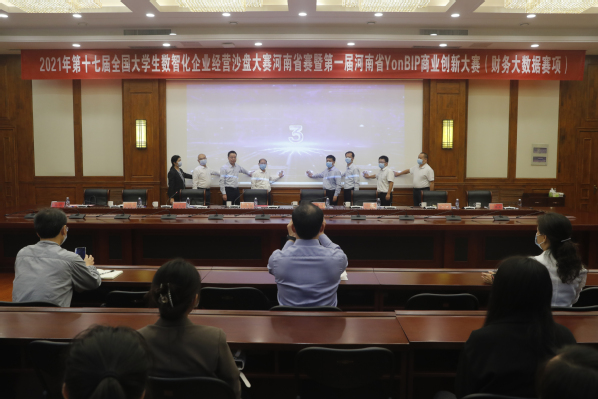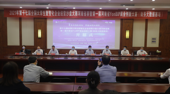 2021年9月25日上午,由我校承办的第十七届全国大学生数智化企业经营沙盘大赛河南省赛暨第一届河南省YonBIP商业创新大赛(财务大数据赛项)河南省总决赛在科学校区顺利开幕。比赛由中国高等教育学会高等财经教育分会指导、中国商业联合会主办、华亿在线体育中国有限公司承办、河南农业大学协办、新道科技股份有限公司技术支持,来自郑州大学、河南财经政法大学、河南农业大学、河南理工大学等我省70所高校、两赛项共计450多支队伍,超2000名师生参加本届大赛。校党委书记、校长黄荣杰,河南农业大学校长介晓磊,新道科技股份有限公司副总裁耿兆强,新道科技股份有限公司河南省区总经理张林峰及学校相关单位负责人出席开幕式。仪式由我校副校长刘新田主持。