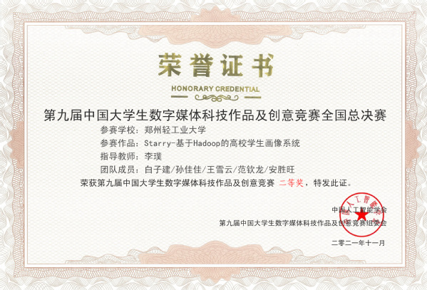 由中国人工智能学会主办的“2021年第九届全国大学生数字媒体科技作品及创意竞赛”比赛结果揭晓。由我校软件学院老师李璞指导,学生白子建、孙佳佳、王雪云、范钦龙、安胜旺完成的科技创新作品《Starry-基于Hadoop的高校学生画像系统》荣获全国二等奖。大赛是中国人工智能学会主办的重要赛事之一,也是数字媒体技术领域的品牌赛事,已成功举办9届。受到国内外众多相关研究机构及高校的广泛关注。本届大赛共有458所高校共3219个参赛团队提交的参赛作品,近2万名指导教师和学生参与作品创作与展示,所参与的高校包括:中国科学院、清华大学、南京大学、浙江大学、北京航空航天大学、北京理工大学、同济大学、天津大学、山东大学、暨南大学、江南大学等知名高校的师生团队。(通讯员:程赞)