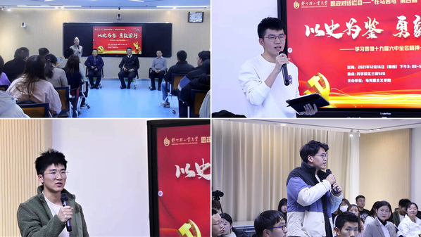 此次对话以“以史为鉴,勇毅前行”为主题,围绕学习贯彻党的十九届六中全会精神进行了深入交流。党委讲师团成员聂海杰博士从总结党的百年奋斗重大成就和历史经验的重大意义,“两个确立”的决定性意义以及新时代党的历史使命等方面做主旨报告。党委讲师团成员马寒博士、聂海杰博士、陈亮博士等聚焦《中共中央关于党的百年奋斗重大成就和历史经验的决议》中的重大理论和现实问题,就学生在学习《历史决议》过程中遇到困惑进行了深入系统地阐释和解答。通过思想交锋与理论碰撞,深化了学生对党的百年奋斗重大成就和历史经验的理解和把握,增强了树立“四个意识”、坚定“四个自信”、做到“两个维护”的政治意识和实践自觉。