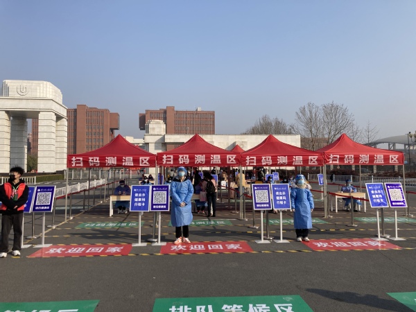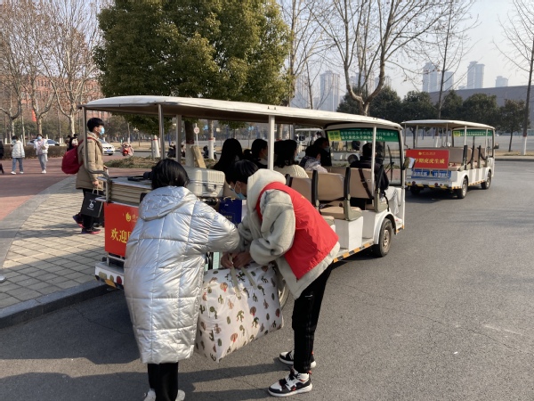 学生返校期间,在两校区校门口接待点,招募近千名师生志愿者为返校学生提供行李搬运、入校核酸检测等暖心服务,并对返校学生进行体温检测、行李消杀、48小时核酸检测结果查验、行程卡查验及身份核验等工作,严把校门入口关,筑牢校园安全“第一道防线”。安排校内接驳车,帮助返校学生运送行李物品。学生入校后,各学院深入学生宿舍走访慰问,及时了解学生寒假以来的生活情况及思想动态,并送上新学期的问候和祝福。