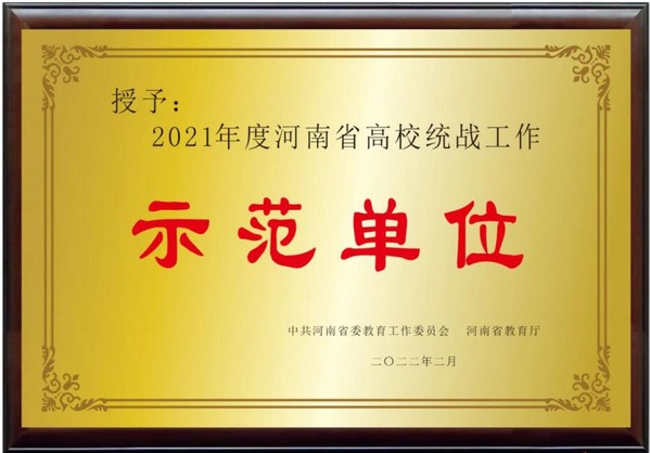 近日,中共河南省委教育工作委员会、河南省教育厅印发《关于2021年河南省高校统战工作示范单位考核情况的通报》,学校被授予“2021年度河南省高校统战工作示范单位”称号。