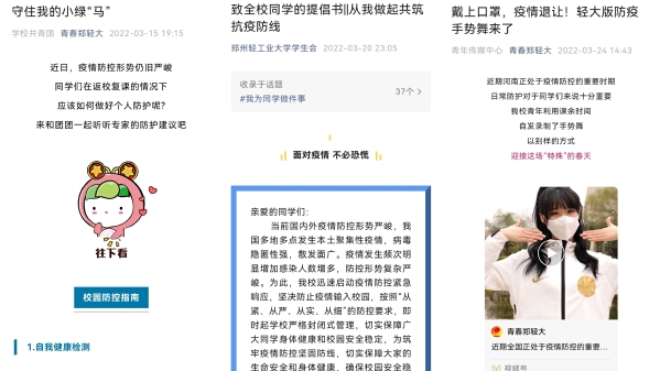 结合学校疫情防控工作安排,迅速集结青年志愿者和学生骨干600余人次,在校内开展“佩戴口罩 文明劝导”志愿服务,每一句“请您戴好口罩”的提醒,都是青年志愿者对同学们健康安全的默默守护。第一时间发布校园防疫指南和《致全校同学的倡议书||从我做起 共筑抗疫防线》,组织青年学生录制抗疫“手势舞”,号召同学们露出微笑,戴好口罩,无惧风浪,静待花开。定期推送个人防护指南、防疫政策宣传等内容,加强疫情防控教育,普及防疫知识,引导广大青年科学认识、理性应对疫情。