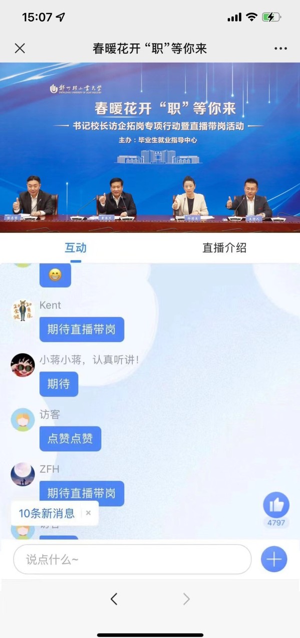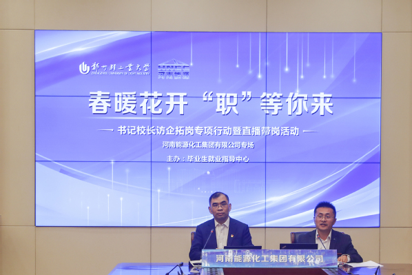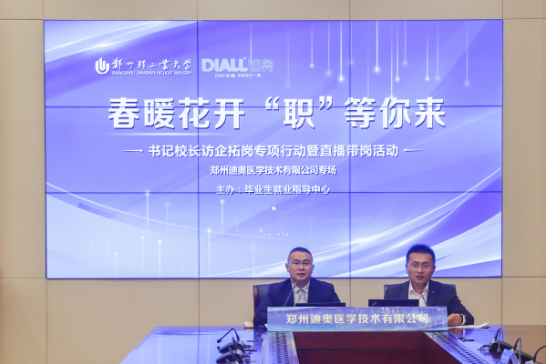 4月7日,学校“春暖花开 ‘职’等你来” 书记校长访企拓岗暨毕业生直播带岗活动在科学校区双创中心第一会议室举办。校党委书记、校长黄荣杰,校党委副书记张志坚出席活动现场。郑州高新技术产业开发区管理委员会人力资源局局长冷清玉、河南能源化工集团有限公司人力资源部总经理、河南能源人力资源发展集团有限公司董事长周建峰、郑州迪奥医学技术有限公司副总经理邢正伟应邀参加活动。