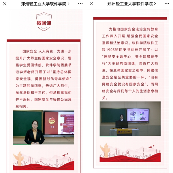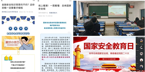 学校有关部门通过微信公众号推出《第七个全民国家安全教育日主题展览》和网络防骗小知识,让国家安全意识深深扎根于同学们心中,同时,组织团员青年进行“国家安全和保密知识竞答”和“金融安全知识竞答”,评选出校内国家安全知识竞赛“百强达人”。各班级和团支部通过分享发生在大学生中的国家安全相关案例,引导学生认真学习领会习近平总书记“总体国家安全观”重大战略思想的深刻意蕴,自觉做新时代国家安全的捍卫者,为维护国家安全贡献青春力量。