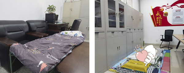 为了开展工作方便,老师们索性将 “家”和“床”安在了办公室,用乐观的心态面对生活上暂时的困难。