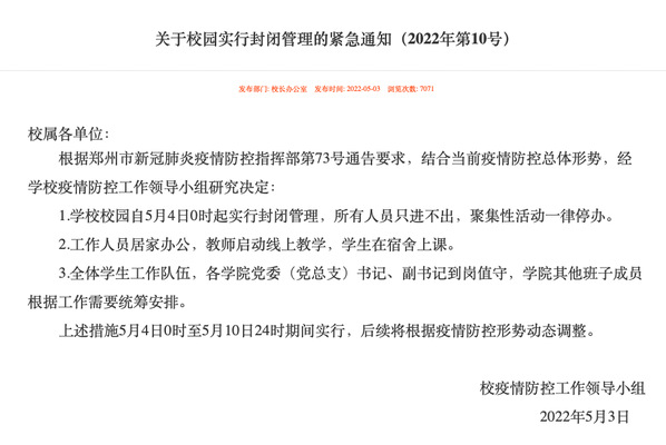 鉴于当前郑州市严峻复杂的疫情防控形势,为有效阻断病毒传播,根据郑州市新冠肺炎疫情防控指挥部第73号通告要求,结合当前疫情防控总体形势,经学校疫情防控工作领导小组研究决定,我校实行校园全封闭管理。