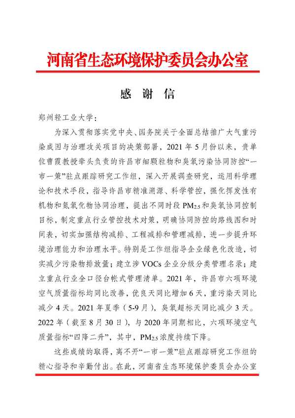 9月1日,河南省生态环境保护委员会办公室向我校发来感谢信,对我校在河南省污染防治攻坚工作中的辛勤付出和显著成效表示衷心感谢。