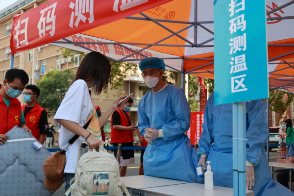 学校门口、绿荫小道,宿舍门口,接过你的行囊,坐上接驳车,熟悉的脸庞,灿烂的笑容。口罩遮不住亲切的话语,马甲在身便是责任。