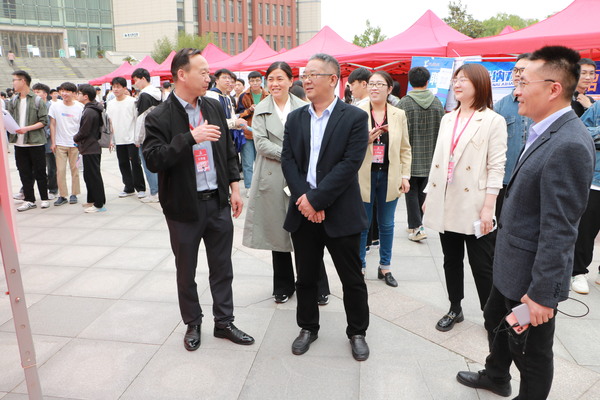 4月13日,学校协同郑州市高新区人力资源局在科学校区逸夫图书馆南广场联合主办“就业服务进校园成长圆梦在高新”暨高新区组团企业综合招聘会。副校长周立明与高新区人力资源局副局长徐萍深入招聘会现场调研指导工作,毕业生就业指导中心负责同志和相关人员陪同。