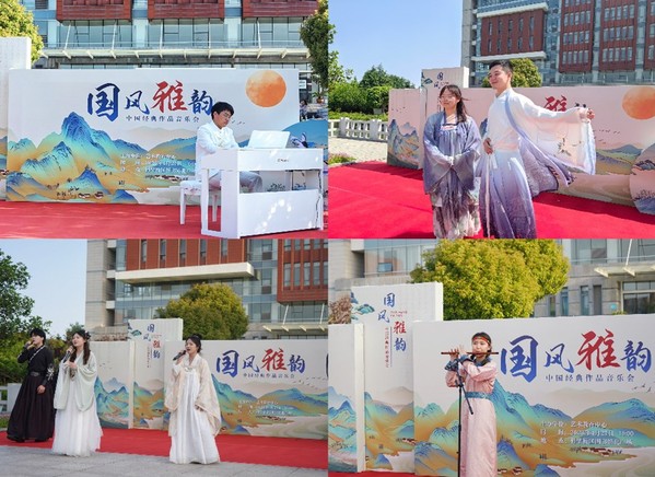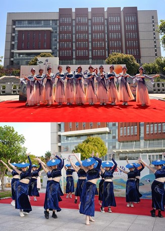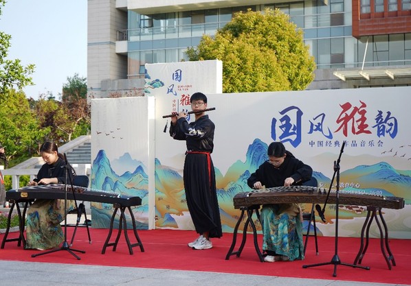 清雅亮丽的舞台中央,一个个精心准备的节目绚丽纷呈。既有用二胡、琵琶、笛子等民族乐器为大家演奏的中国传统曲目《彩云追月》、《将军令》、《敕勒歌》……也有用钢琴、吉他等西洋乐器改编演绎的中国风乐曲《枫桥夜泊》《青花瓷》《茉莉花》……既有用流行唱法表达的民族风歌曲《浓情淡如你》《吹梦到西洲》《兰亭序》……更有的《昆韵》《陶醉了》等民族舞作品的表演。音乐会吸引了大批学生和老师驻足观赏,大家认真聆听体会民族经典音乐所描述的美好情境,感受中国传统文化对心灵的滋养和震撼。很多同学不由自主地随着熟悉的旋律打起节拍,跟着轻声哼唱,与舞台表演积极互动,广场融汇成为了一片音乐的海洋。