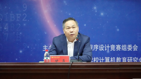 甘勇代表河南省计算机教育研究会致辞,他介绍了大赛的基本情况,希望同学们能通过大量的编程实践提升计算思维能力和团队合作能力,为后继专业课的学习打下坚实的基础。