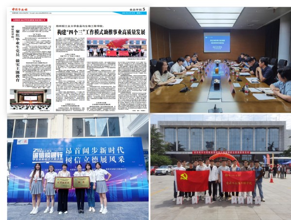围绕党建品牌建设,学院党委积极探索“四个三”工作模式,坚持党建引领推动学院事业高质量发展,工作案例被学习强国、中国食品报等媒体宣传报道,食品科学与工程系教工党支部“党建引领聚合力 服务企业促发展”获全省高校基层党支部抓党建创新典型案例。围绕提升学院社会影响力,举承办中国食品检验检测与质量控制高峰论坛、第四届食品科学与营养健康国际研讨会。聚焦学科专业高质量发展,冷链食品加工与安全控制重点实验室获教育部培育建设,获河南省本科高校产教融合教师创新流动工作站,入选国家级一流本科课程1门。围绕学生高质量就业,开展访企拓岗活动10余次,为毕业生提供更多实习和就业机会。围绕学生成长成才,强化价值引领,组织师生开展“青春热血 奉献有我”无偿献血等志愿服务活动10余次,学院学生在“越团结豫有力”教育实践活动中获优秀作品集、人气之星奖,河南省大学生“诚信校园行”学生资助知识大赛总决赛中获铜奖、学校2023年“互联网+”大学生创新创业大赛获特等奖。