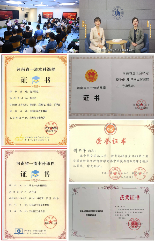 充分利用现代信息技术,创建“形势与政策课靶向式教学与资源库”,累计学习访问量超3700万次,位居校内课程资源排行榜第1名;录制“开学思政第一课”13期、中国共产党精神谱系12期,被学习强国等学习平台转载21期;率先举办“在马言马”思政对话栏目,“在马言马”思政综合实践课实现了与郑州大学、中原工学院、河南财政金融学院四校联动,多次被中国日报、凤凰网等媒体平台报道。坚持“以赛促教”,切实提升教学质量和社会影响力,获全国首届思政课教学展示活动二等奖2人;第六届全国高校青年教师教学竞赛二等奖1人(全省思政组唯一);河南省首届思政课教学技能竞赛特等奖、一等奖2人;2021年,全省教学技能大赛特等奖1人并获“河南省五一劳动奖章”;承办河南省高校思想政治理论课教学技能大赛等,获特等奖、一等奖12人。获奖级别和数量位居省内高校前列。