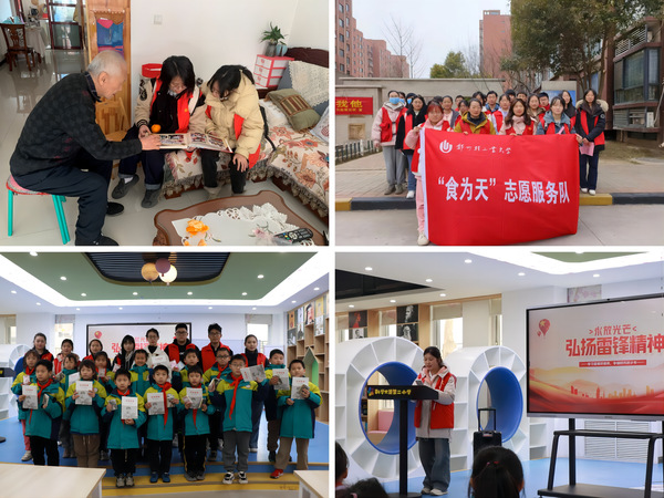 食品与生物工程学院组织学生志愿者深入基层社区,协助社区规范非机动车停放、普及食品安全知识、走访关爱独居老人。校第27期“青马工程”培养班学员、青马学会会员走进郑州市高新区科学大道第二小学,开展“手牵手 学雷锋”志愿服务进校园活动,用青少年听得懂、记得住的“童言童语”向孩子们讲述了雷锋的生平、雷锋的故事、雷锋精神和雷锋纪念日的由来,让雷锋精神深入更多少年儿童心中。