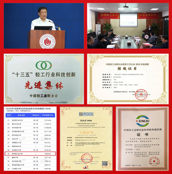 学校连续4年获全国高校科技成果转化合同金额100强,当选中国轻工业联合会副会长单位、中国机械工程学会理事单位、中国产学研合作促进会常务理事单位,荣获“十三五”轻工业科技创新先进集体和中国产学研合作创新与促进奖,服务行业需求能力持续增强。