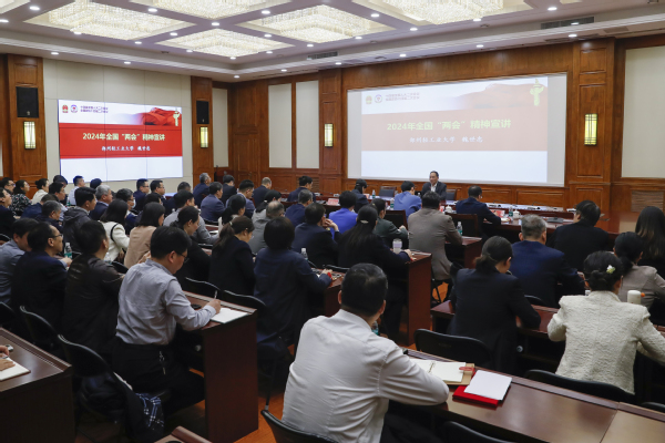 全国政协委员、校长魏世忠作全国两会精神专题宣讲。他为师生讲解了两会召开的背景、意义,党的十八大以来习近平总书记全国两会下团组的相关情况,传达了习近平总书记在参加江苏代表团、解放军和武警部队代表团、民革科技界环境资源界联组会上的重要讲话精神。从“2023年工作回顾”“2024年经济社会发展总体要求和政策取向”“2024年政府工作任务”三个方面,详细解读了政府工作报告的特点及战略安排。介绍了政协工作报告、两高工作报告的重点内容,个人提案工作情况。围绕“关于持续加大对河南高等教育支持”等问题,谈了思考和体会。