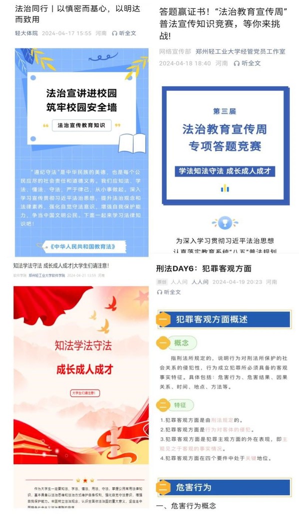 一直以来,学校高度重视法治教育宣传工作,立足工作实际,将法治教育宣传作为贯彻落实教育系统“八五”普法规划的重要举措,切实提升法治宣传教育的实效性,推动法治教育入脑入心。下一步,学校以入选“河南省首批新时代依法治校示范校”为契机,多形式、多层次扎实开展法治教育宣传系列活动,提升师生法治意识和法治素养,切实加强法治校园建设、深入推进依法治教,依法治校,为构建和谐、稳定、法治、安全的校园环境奠定坚实基础。(通讯员:朱一帆)
