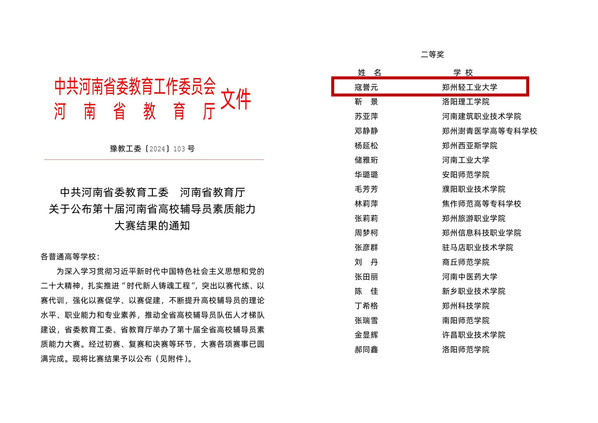 日前,省委教育工委、省教育厅下发了《关于公布第十届河南省高校辅导员素质能力大赛结果的通知》,我校建筑环境工程学院辅导员寇誉元荣获大赛二等奖。