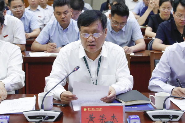 校党委书记黄荣杰教授代表学校领导班子和全体师生员工作表态发言,向专家组、河南省教育厅、河南省高等学校教育教学评估管理服务中心的各位领导表示衷心的感谢。他表示,专家组本着高度负责的态度,对学校的本科教育教学工作进行了一次“全方位、多角度、立体式”体检,开展了大量卓有成效的工作。专家们的指导意见,为学校进一步深化教育教学改革、加快推进一流大学建设提供了指导和动力。学校对专家组的意见建议诚恳授受,并从三个方面扎实做好审核评估的后半篇文章。一是深化认识、提高站位,切实增强抓好问题整改的思想自觉。学校要立足全面落实立德树人根本任务,坚持把抓好评估反馈问题整改,作为当前和今后一段时期的重点工作,以强烈的使命感、责任感、紧迫感,扎实推进反馈问题整改。二是深挖根源、细化措施,不折不扣推进问题整改落地见效。学校领导班子要带领全校上下行动起来,扎扎实实、一丝不苟地对照每一项整改任务,深入开展专题研讨,深刻剖析问题根源,认真制定整改方案,分类分项建立工作台账,确保每一项整改任务落实到位。三是深化改革、健全机制,持续推动学校本科教育教学工作再上台阶。学校要以此次本科教育教学审核评估为契机,紧紧围绕提高人才培养质量这条主线,持续深化教育教学改革,不断增强教育教学基础保障能力,不断完善“三全育人”“五育并举”的育人体系,全面推进学校教育教学管理和治理效能提升,真正做到以评定向、以评促强。