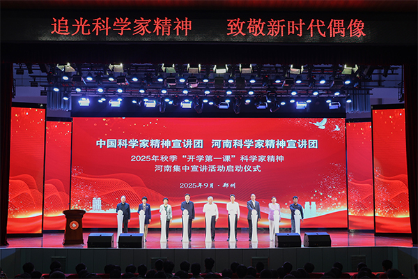 9月25日下午,中国科学家精神宣讲团、河南科学家精神宣讲团2025年秋季“开学第一课”科学家精神集中宣讲活动启动仪式在我校东风校区大礼堂举行。宣讲团成员中国科学院院士、中国科学院化学研究所研究员李永舫,中国地质调查局李四光纪念馆馆长特别助理邹宗平,全国政协委员、茅以升科技教育基金会理事长茅玉麟,北京大学王选纪念室主任丛中笑,隆平农业科技黄埔研究院常务副院长李建武,省科协主席刘晓永,校党委书记张志坚、校长魏世忠、党委副书记杨新宇出席启动仪式。启动仪式由省科协副主席邓洪军主持。